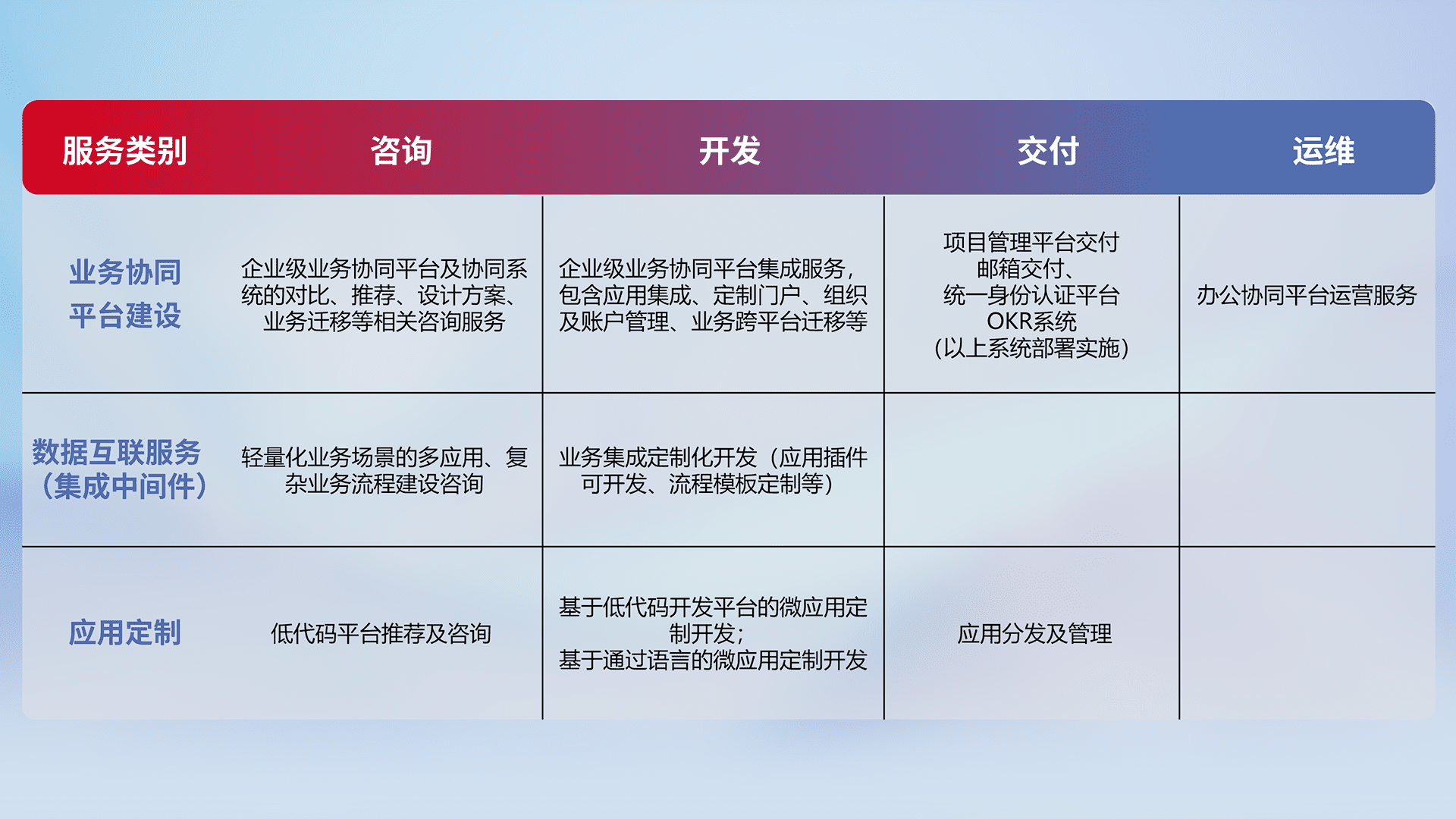 针对钉钉、、、、企微、、IDaas等平台级产品提供产品的规划、、、方案、、、交付、、定制化开发等服务,,实现如统一协同办公、、、、智能客户服务、、混合会议管理、、、、智能数据查询、、、等业务场景,,,,实现数字化转型。。。。